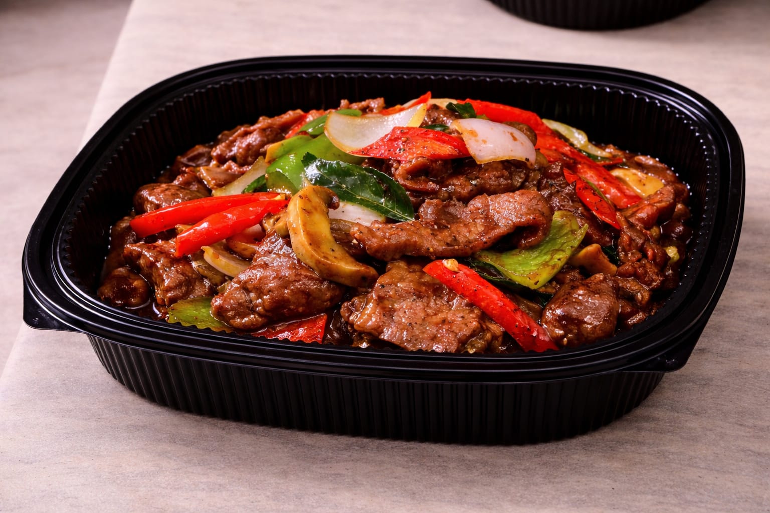 Dishes are placed on disposable, reheatable black trays.
