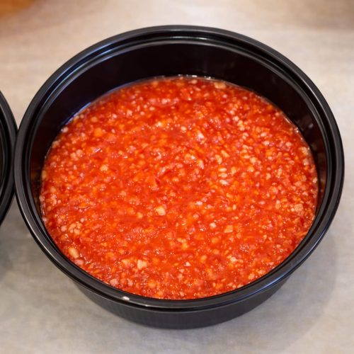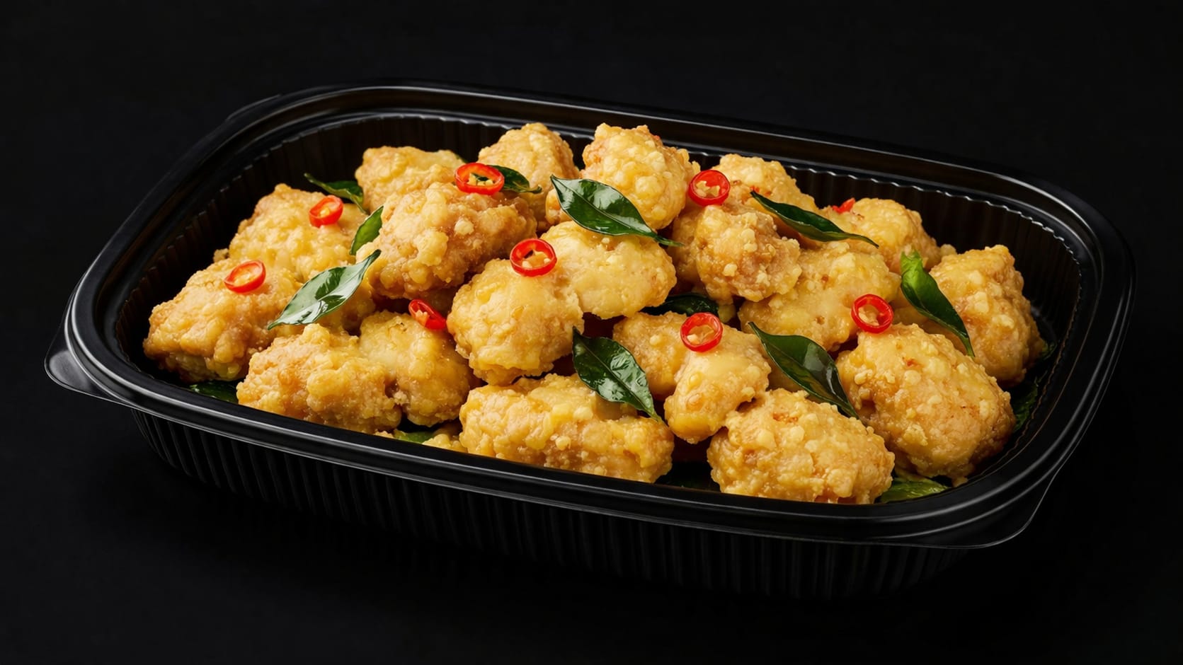 Dishes are placed on disposable, reheatable black trays.
